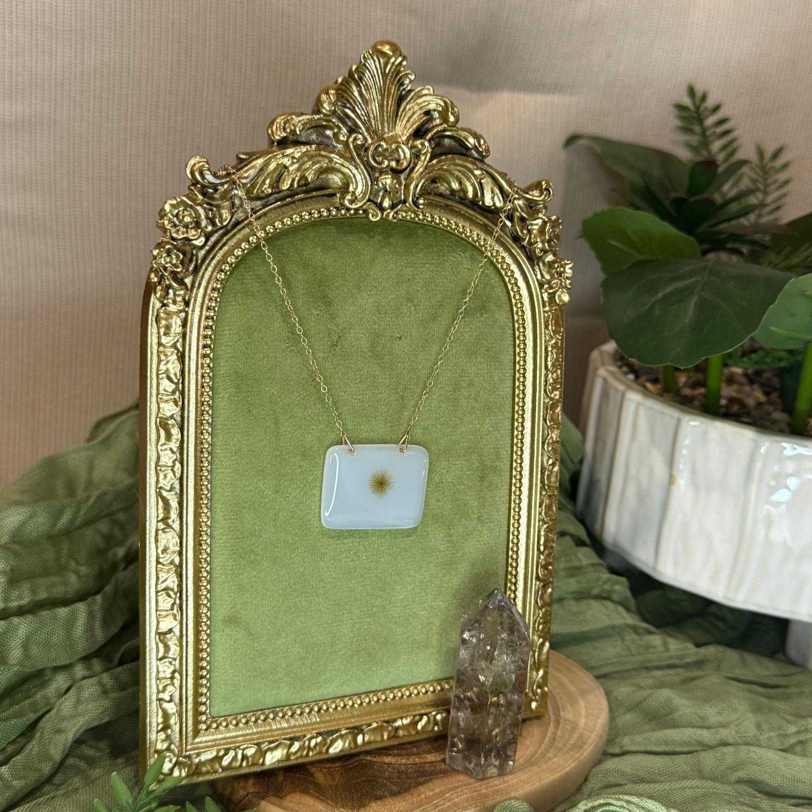 'Earth's Daisy' is a pendant that celebrates the quiet poetry of nature. Crafted from Dendritic Agate on a gold-filled chain with golden accents, its centre reveals a daisy-like pattern, a rare and delicate gift from the earth. Dendritic agate is formed when iron or manganese flows into the stone over millennia, creating natural fern or flower like inclusions. This unique stone carries the energy of growth, grounding, and renewal, as if a wildflower had bloomed within the heart of the earth itself.