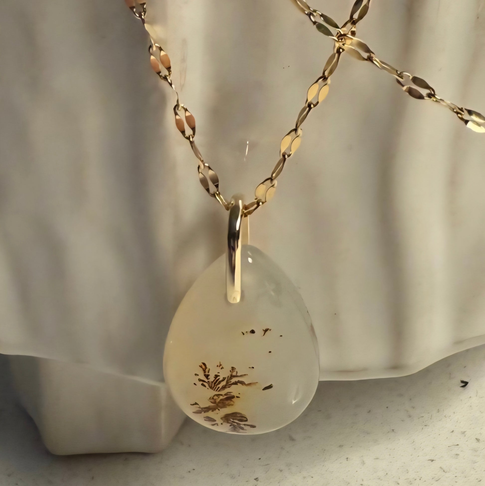A one of a kind Dendritic Agate pear shaped pendant elegantly suspended from a gold stainless steel, non-tarnish chain. The delicate branching inclusions within the stone resemble miniature landscapes like frozen trees or moss captured in stone, making each pendant completely unique. The sleek gold chain complements the earthy beauty of the agate, creating a timeless piece that can be worn daily or saved for special occasions. Durable, elegant, and full of natural character, this pendant carries both beauty and meaning.