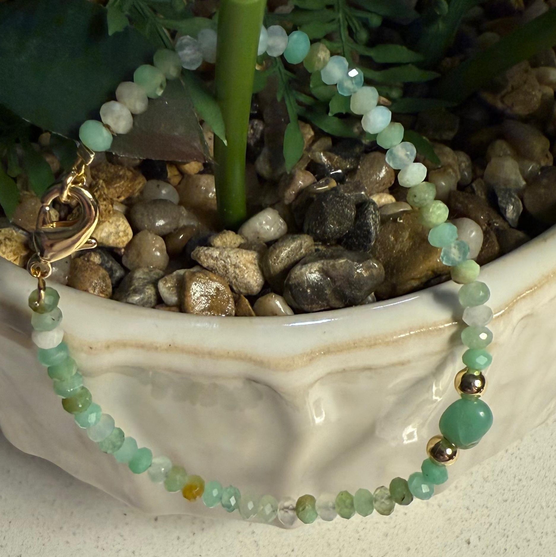 Fresh and vibrant, this piece is crafted with shimmering 3mm faceted Chrysoprase beads, their apple-green glow full of life and renewal. At the centre rests a slightly larger 6mm Chrysoprase stone, drawing the eye to its natural beauty. The design is completed with elegant gold tarnish-resistant accents, adding warmth and durability while enhancing the stone’s uplifting energy. Delicate yet striking, this piece captures the essence of growth and vitality.