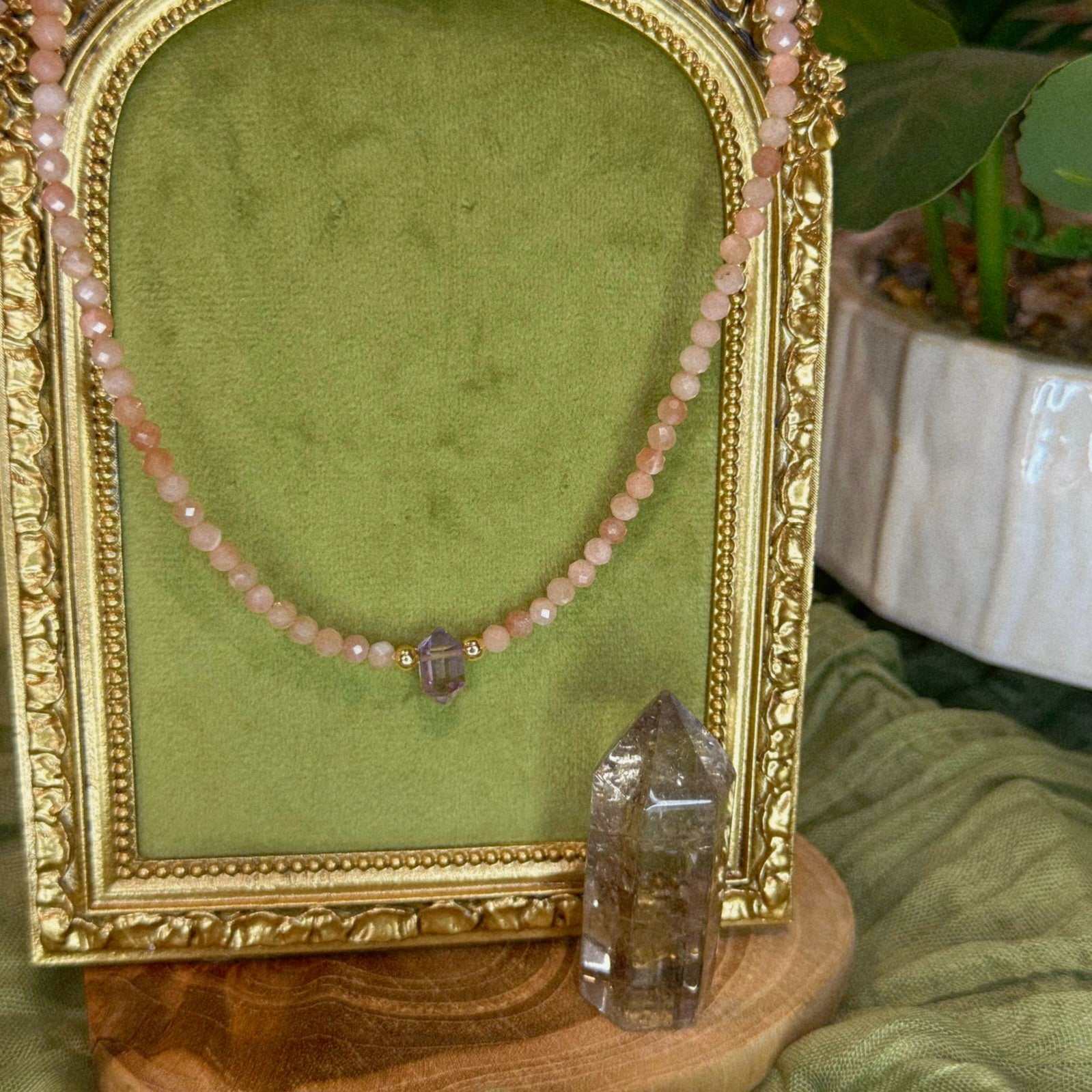 This radiant design brings together the golden sparkle of 3mm faceted Sunstone beads with a striking double-pointed Ametrine centre stone. The soft shimmer of Sunstone adds warmth and vitality, while the faceted cut enhances its natural brilliance. The central Ametrine, a fusion of Amethyst and Citrine, glows with a balance of violet and golden hues, symbolising harmony and transformation. Finished with gold tarnish-resistant accents, this piece blends elegance with durability, making it a perfect talisman of joy and balance.