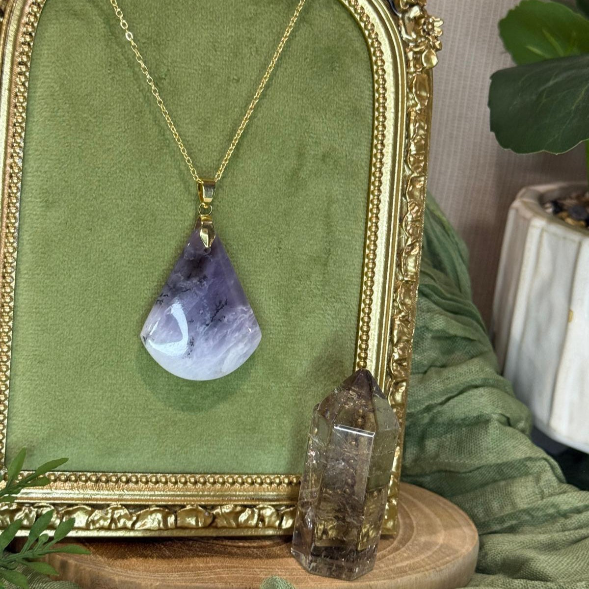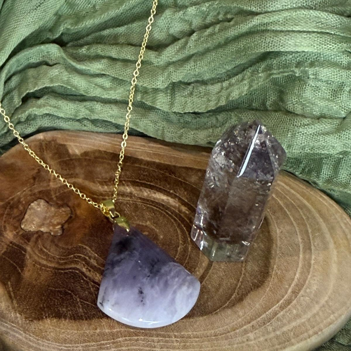 Veil of Dawn is a pendant shaped by nature’s artistry, crafted from Chevron Amethyst. With its striking layers of deep violet, soft lilac, and snowy white quartz, it mirrors the meeting of night and morning light. Formed when amethyst and quartz grew together over millennia, its natural chevron patterns symbolise alignment and flow. Known as the stone of spiritual vision, Chevron Amethyst brings clarity of mind, protection, and a deeper connection to intuition. Set on a gold filled chain and a gold tarnish resistant bail, this piece becomes a talisman of peace and awakening, like first light spilling over the horizon.