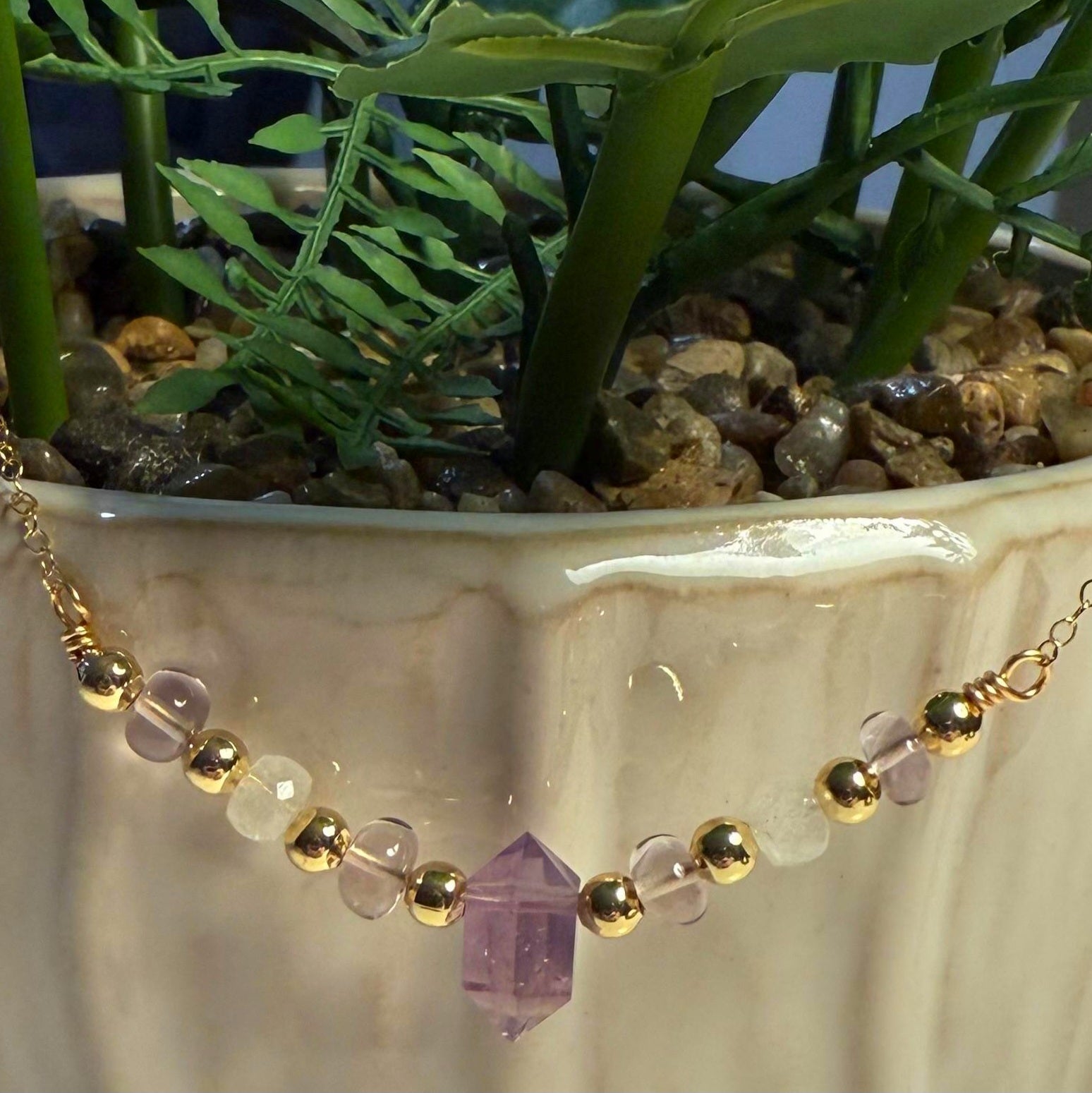 This enchanting pendant brings together the mystical beauty of Amethyst and the luminous glow of Moonstone. Smooth Amethyst rondelle beads and sparkling faceted Moonstone beads are delicately arranged to highlight a striking double-pointed Amethyst centrepiece, creating a design that feels both radiant and grounding. The gemstones are set on a gold-filled chain, accented with gold-plated, tarnish-resistant beads, blending elegance with durability. The deep purple of Amethyst contrasts beautifully with the ethereal shimmer of Moonstone, making this piece a perfect union of earth and sky.
